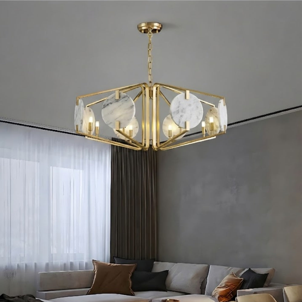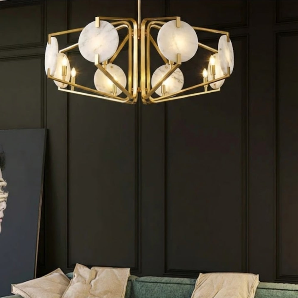 Altın veya bronz detaylarla birleşen mermer avize modelleri, klasik mobilyalarla kusursuz bir bütünlük sağlar.