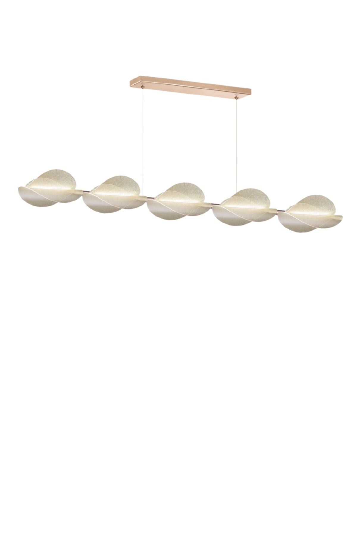 | Tasarım Tipi | Modern, İnce Uzun Sıralı (Yatay) Sarkıt (Ada mutfak ve uzun yemek masaları için yaprak/kıvrımlı panel formu) |