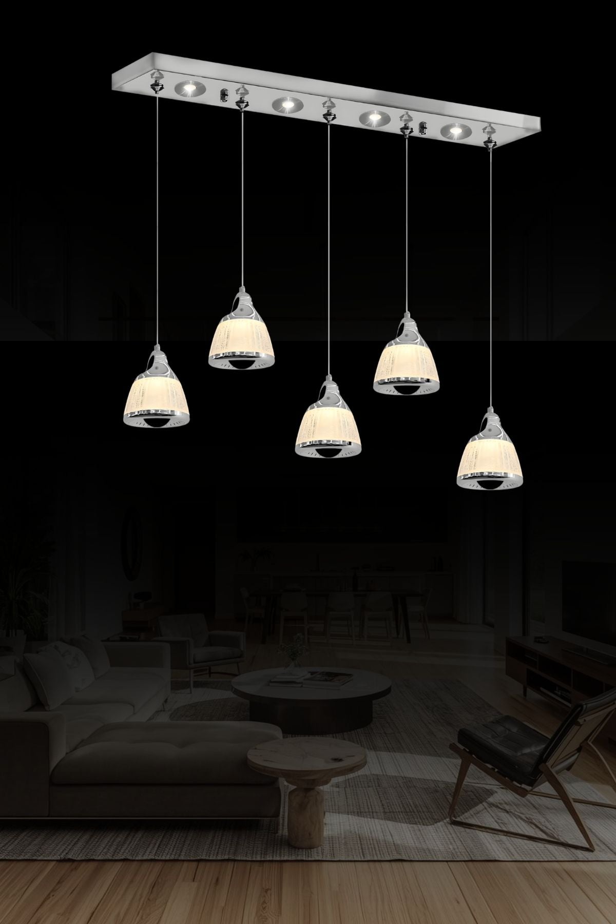 | Tasarım Tipi | Modern, 5'li Sıralı (Yatay) Sarkıt (Ada mutfak ve uzun yemek masaları için çan/kubbe formlu başlıklar) |