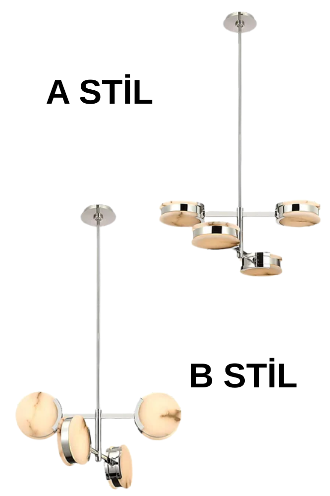 Marvella Yuvarlak 4 Kollu Mermer Sarkıt Avize, dairesel mermer başlıkları ve dengeli kollu yapısıyla modern iç mekânlara zarif bir mimari dokunuş kazandırır. Yuvarlak formdaki doğal mermer diskler, ışığı yumuşak bir şekilde filtreleyerek sıcak ve homojen bir aydınlatma sağlar.